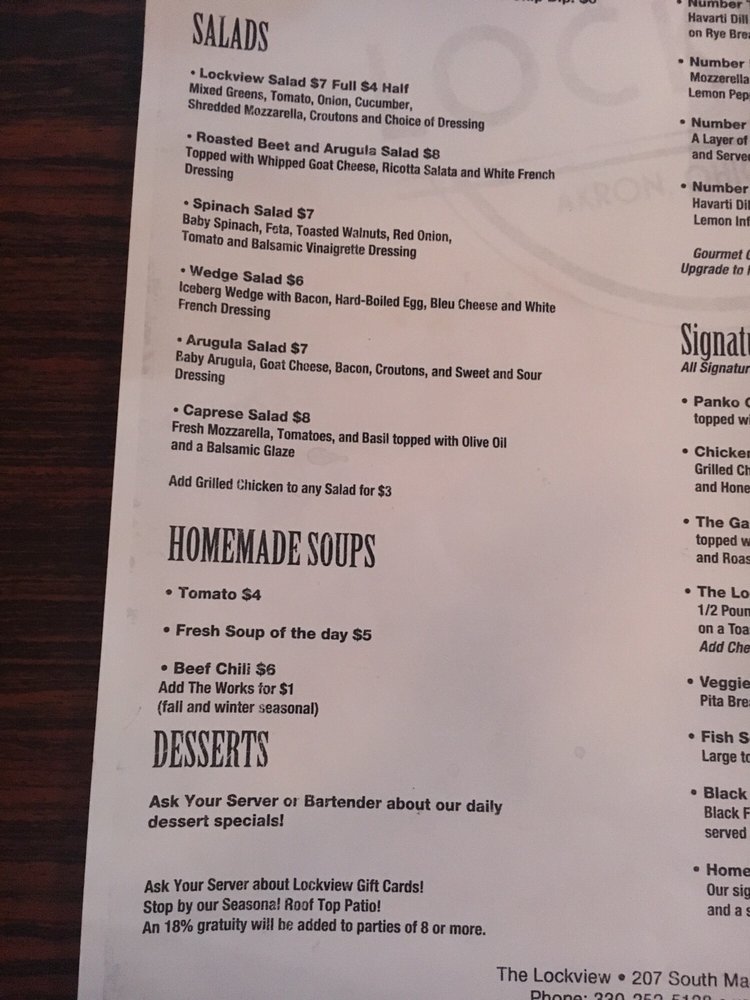 The Lockview in Akron, OH offers American cuisine with a focus on gourmet grilled cheese sandwiches and salads. The menu features starters like deep-fried pepperoni and sweet potato fries, as well as housemade hummus and macaroni & cheese bites. For soup and salad options, customers can enjoy classic Caesar salad, Caprese salad, and Chef salad, along with chili and housemade tomato soup. The star of the show is the gourmet grilled cheese selection, including options like American cheese on Texas toast and Italian sausage. Customers have praised the food quality and friendly staff, making it a go-to spot for a casual and relaxed dining experience. With a range of amenities like outdoor seating, free Wi-Fi, and tip auto-included for large parties, The Lockview provides a welcoming and convenient dining environment for all.